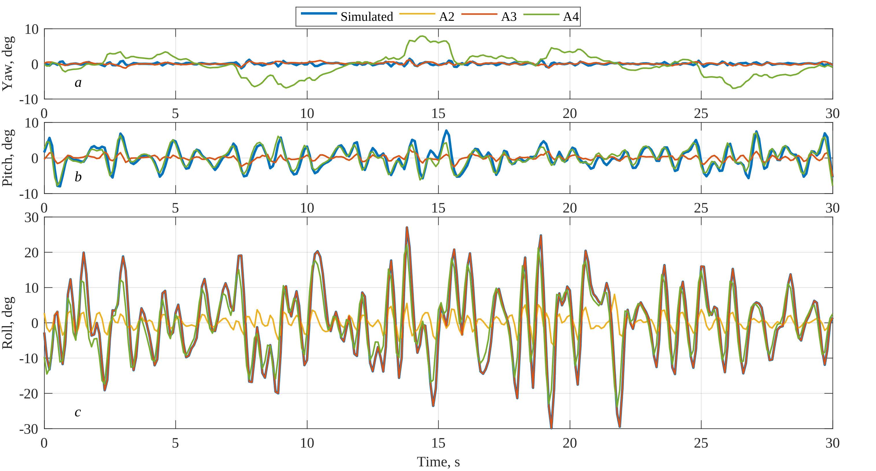 Fig. 6. Euler angles (roll/pitch/yaw) estimated using algorithms A2–A4 based on model calculations