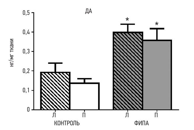 Рис. 1. Изменение уровня дофамина (ДА) в обонятельном бугорке под действием β-фенилизопропиламина. Группы животных: контроль — получавшие физиологический раствор, ФИПА — получавшие β-фенилизопропиламин. Заштрихованными столбиками (Л) показано значение соответствующего параметра в левом полушарии, незаштрихованными (П) — в правом. *p < 0,05 — достоверные отличия от соответствующего показателя, измеренного у интактных животных по t-критерию Стьюдента