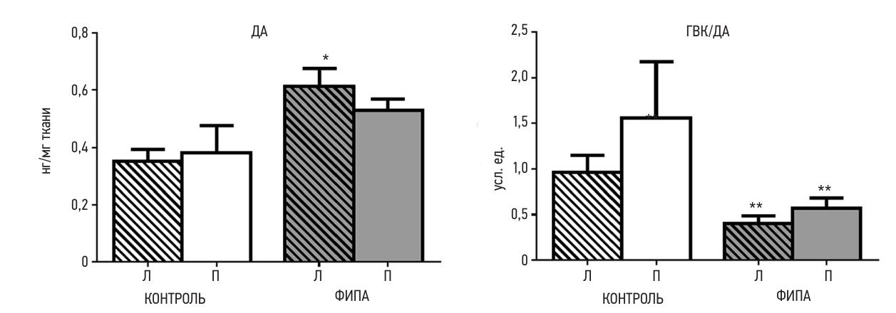 Рис. 2. Изменение уровня дофамина (ДА) и соотношения гомованилиновой кислоты и дофамина (ГВК/ДА) в стриатуме под действием β-фенилизопропиламина. Группы животных: контроль — получавшие физиологический раствор, ФИПА — получавшие β-фенилизопропиламин. Заштрихованными столбиками (Л) показано значение соответствующего параметра в левом полушарии, незаштрихованными (П) — в правом. *p < 0,05, **p < 0,01 — достоверные отличия от соответствующего показателя, измеренного у интактных животных по t-критерию Стьюдента