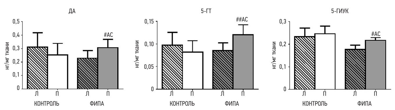 Рис. 4. Появление асимметрии содержания дофамина (ДА), серотонина (5-ГТ) и 5-гидроксииндолуксусной кислоты (5-ГИУК) в гиппокампе под действием β-фенилизопропиламина. Группы животных: контроль — получавшие физиологический раствор, ФИПА — получавшие β-фенилизопропиламин. Заштрихованными столбиками (Л) показано значение соответствующего параметра в левом полушарии, незаштрихованными (П) — в правом. #АСp < 0,05, ##АСp < 0,01 — проявления асимметрии (различия между аналогичными показателями левой и правой стороны мозга) — по t-критерию Стьюдента