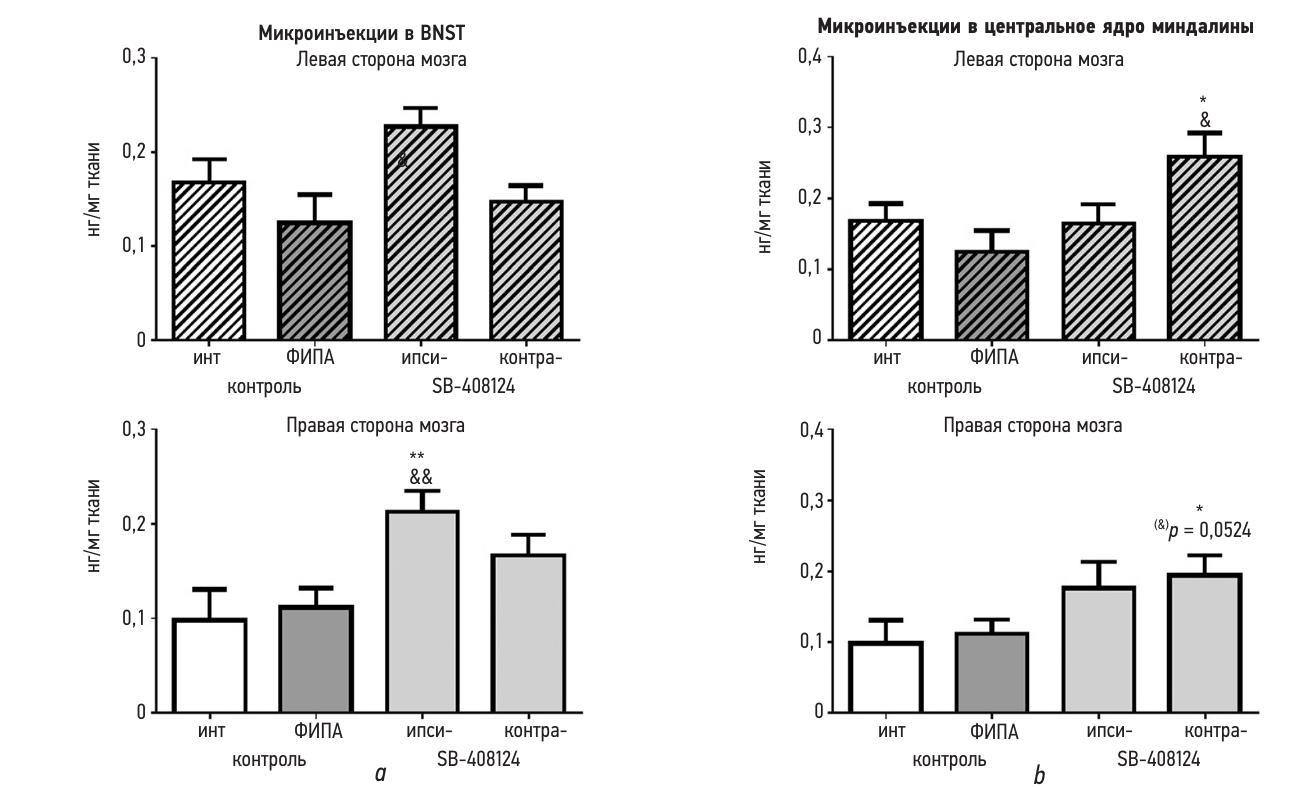 Рис. 6. Аналогичные изменения содержания 5-гидроксииндолуксусной кислоты (5-ГИУК) в стриатуме под влиянием унилатеральных микроинъекций SB-408124 в ядро ложа конечной полоски (bed nucleus of the stria terminalis — BNST) (а) и центральное ядро миндалины (b): правостороннее введение антагониста орексина вызывает повышение 5-ГИУК в левом (контралатеральном) стриатуме по сравнению с животными, получавшими ФИПА. Группы животных: инт — интактные, ФИПА — после внутрибрюшинного введения ФИПА (1 мг/кг веса), ипси- — после микроинъекции SB-408124 на соответствующей стороне мозга, контра- — после микроинъекции с противоположной стороны. *p < 0,05 — достоверные отличия от соответствующего показателя, измеренного у интактных животных. &p < 0,05; (&)p = 0,0533 — отличия от соответствующего показателя у крыс, получавших ФИПА — по результатам ANOVA