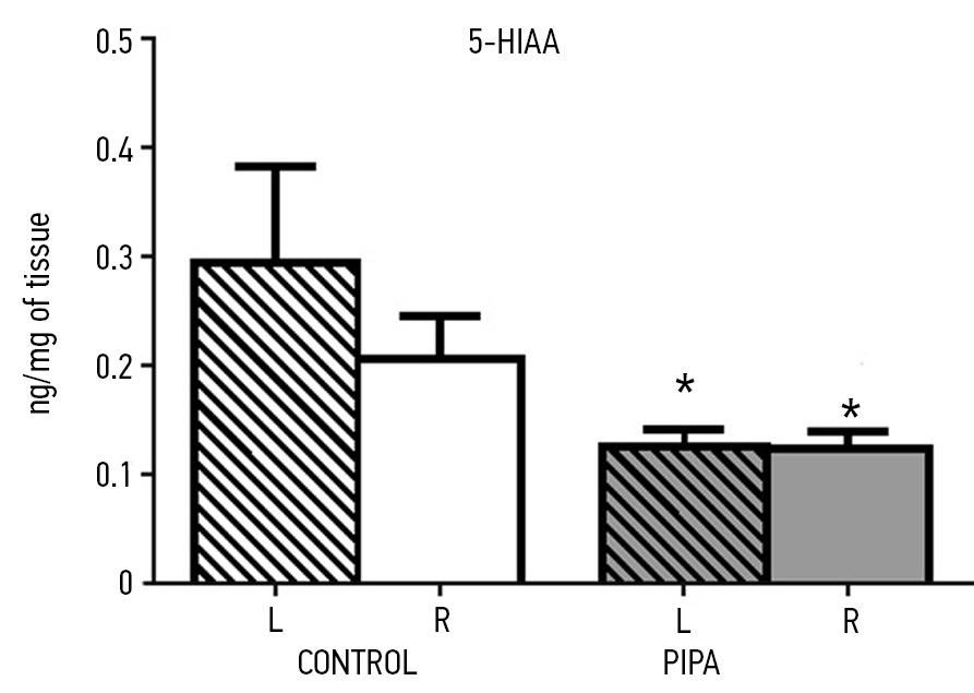 Fig. 3. Change in 5-hydroxyindoleacetic acid (5-HIAA) level in the prefrontal cortex under the action of β-phenylisopropylamine. Animal groups: control animals received saline, whereas PIPA animals received β-phenylisopropylamine. The shaded bars (L) show the value of the corresponding parameter in the left hemisphere and the unshaded (R) in the right hemisphere. *p < 0.05, significant differences from the corresponding parameter measured in intact animals by Student’s t-test