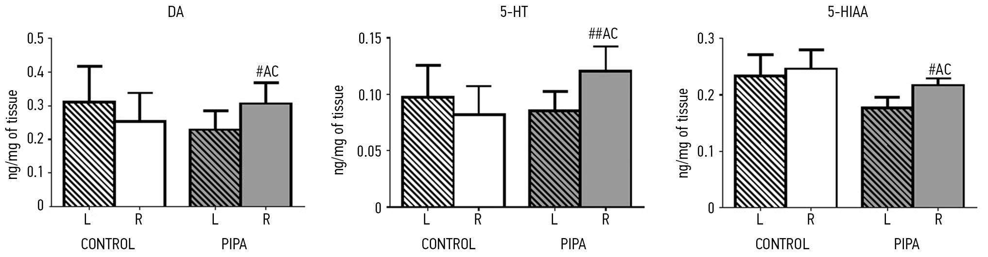 In the prefrontal cortex, PIPA significantly decreased the levels of 5-HIAA (p < 0.05; Fig. 3 and Tables 1 and 5). In the hippocampus, PIPA did not induce statistically significant changes in monoamine metabolism indices but led to the right-sided asymmetry with a predominance of DA, 5-HT, and 5-HIAA levels (p < 0.05; Fig. 4 and Tables 2 and 6).