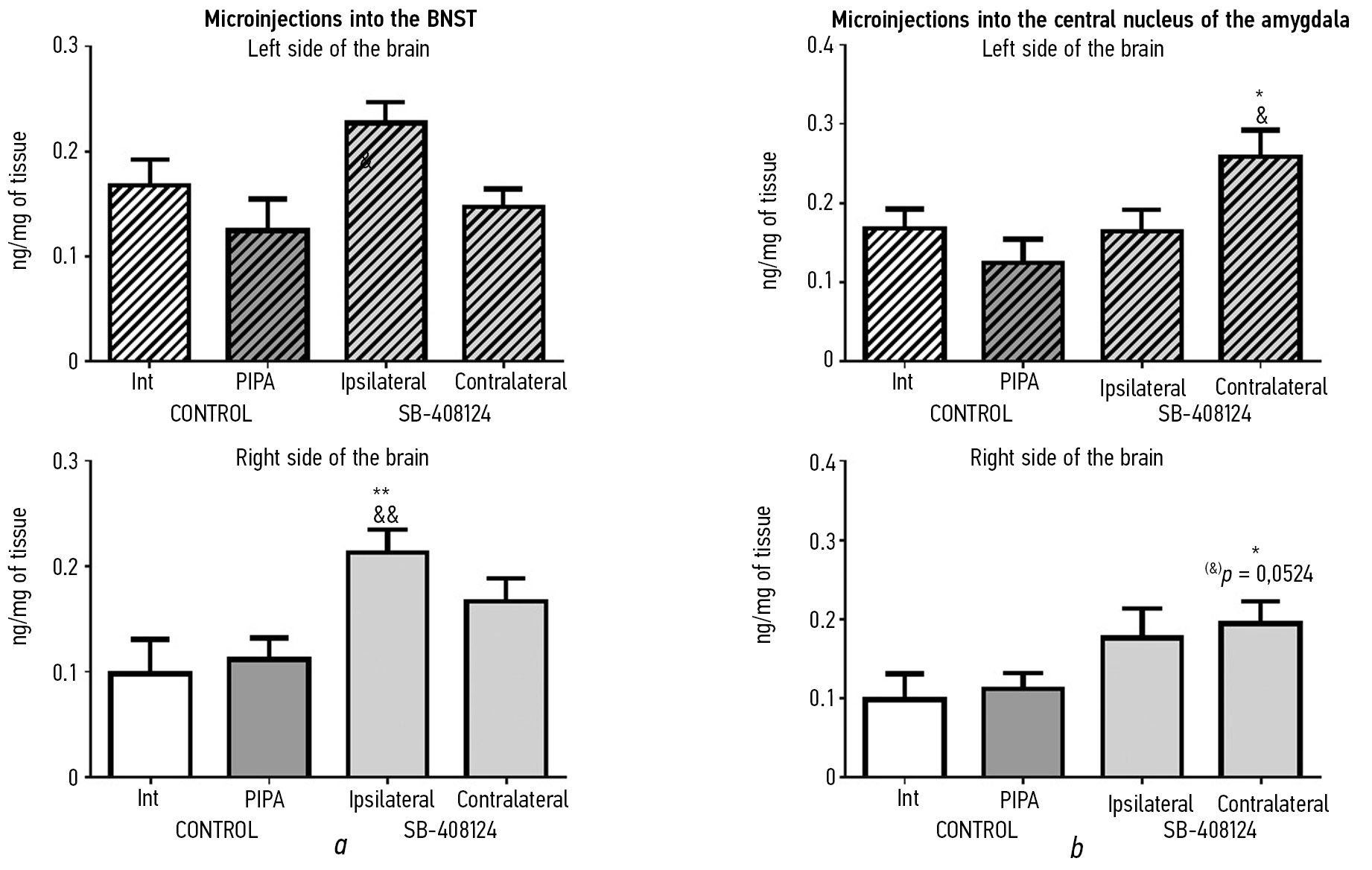 Fig. 5. Changes in serotonin (5-HT) levels in the striatum following unilateral microinjections of SB-408124: (a) in BNST (ipsilateral effects) and (b) in the central nucleus of the amygdala (contralateral effects). Animal groups: int, intact; ФИПА, after intraperitoneal injection of phenylisopropylamine (1 mg/kg weight); ipsi-, after microinjection of SB-408124 on the corresponding side of the brain; and contra-, after microinjection on the contralateral side. *p < 0.05, **p < 0.01, significant differences from the corresponding index measured in intact animals; (&)p = 0.0524, &p < 0.05, &&p < 0.01, differences from the corresponding index measured in animals receiving phenylisopropylamine, based on analysis of variance