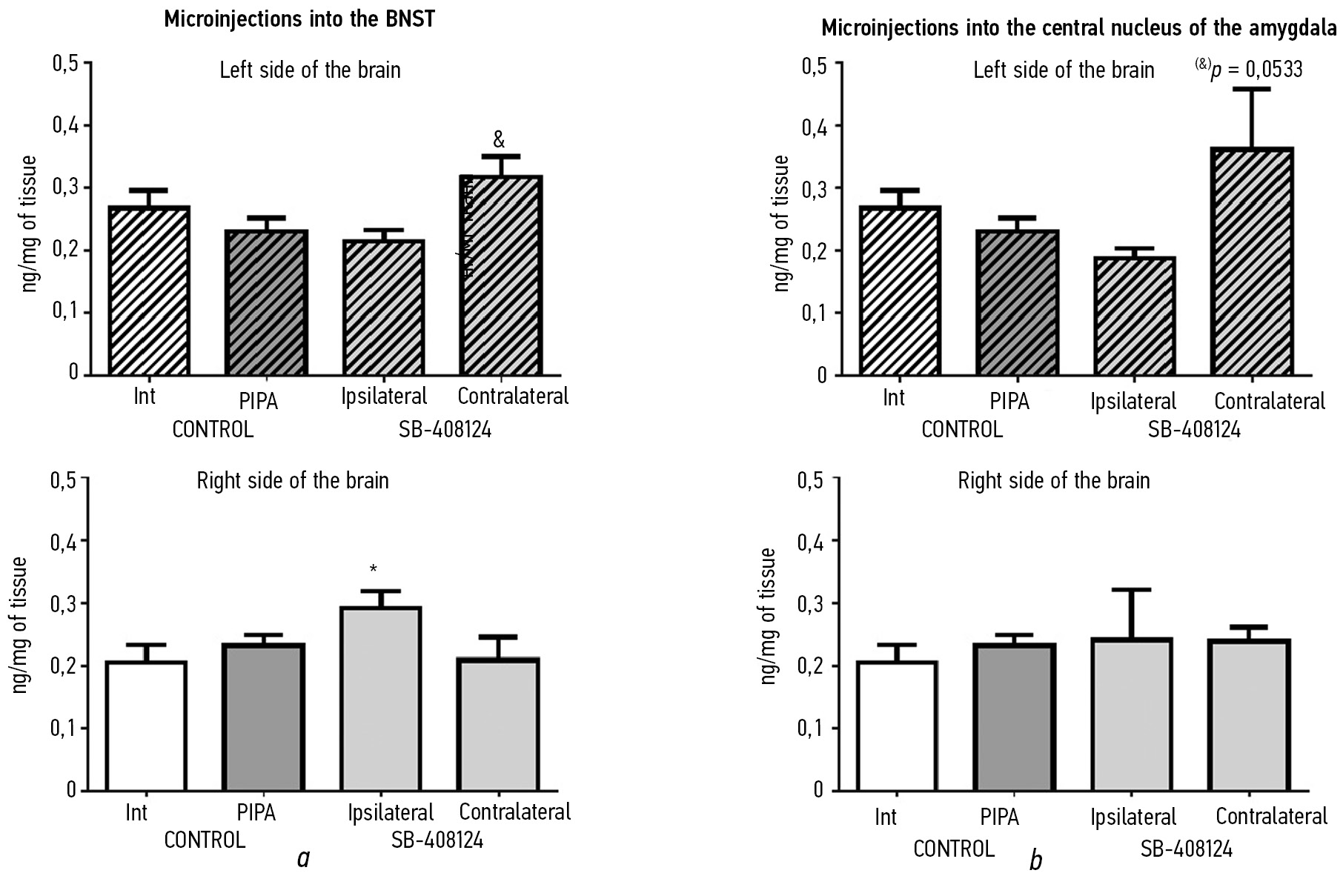 CONCLUSIONS: Right-sided microinjections cause a greater number of changes in monoamine metabolism than left-sided ones. The introduction of SB-408124 into the right structures of the enlarged amygdala increases 5-HIAA levels in the left striatum, whereas microinjections in BNST lead to increased 5-HT levels in the ipsilateral striatum and in the contralateral in the central nucleus of the amygdala