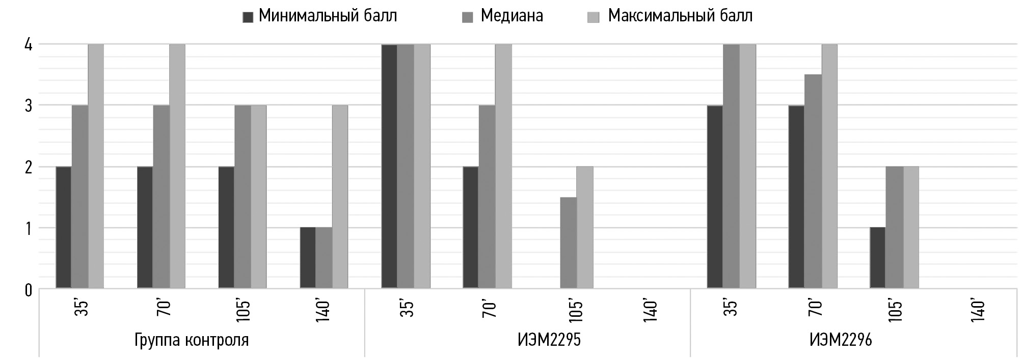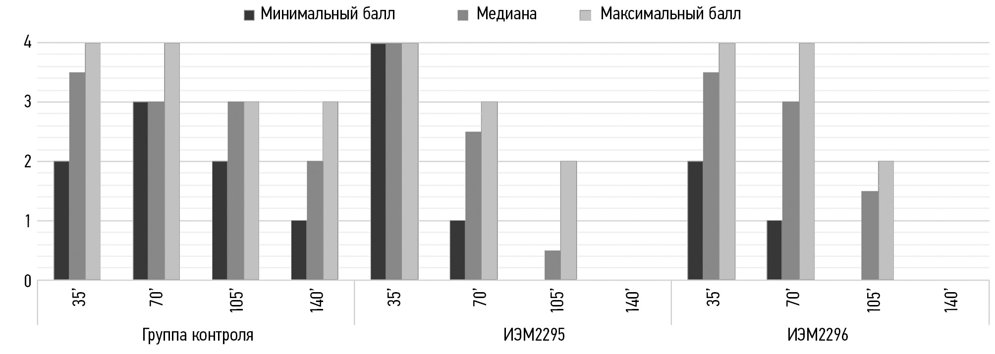 When assessing limb dyskinesia (Fig. 1), statistically significant differences were revealed between the control group and the IEM2295 group at the 70th (p = 0.028846), 105th (p = 0.000203), and 140th (p = 0.000195) minute and between the control group and the IEM2296 group at the 70th (p = 0.039564), 105th (p = 0.000208), and 140th (p = 0.000173) minute.