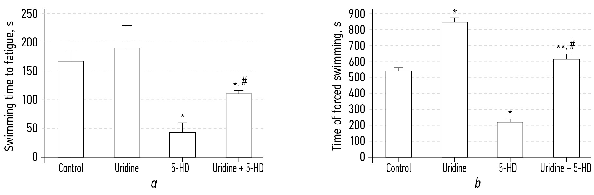 Рис. 1. Влияние уридина на работоспособность крыс в тесте вынужденного предельного плавания с утяжелением 5 ٪; a — время до появления признаков утомления; b — время предельного плавания. *p < 0,05 по отношению к контрольной группе; **p < 0,01 между группами 5-ГД и уридин + 5-ГД; # p < 0,05 между группами уридин и уридин + 5-ГД