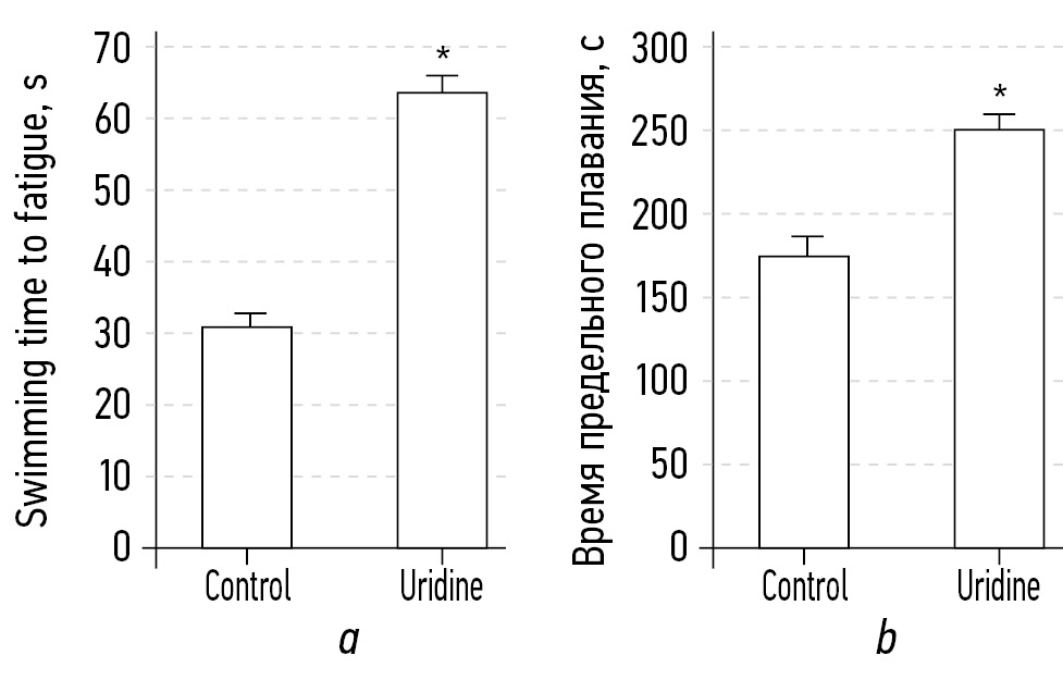Рис. 2. Влияние уридина на работоспособность крыс в тесте вынужденного предельного плавания с утяжелением 7 ٪; a — время до появления признаков утомления; b — время предельного плавания. *p < 0,05 по отношению к контрольной группе