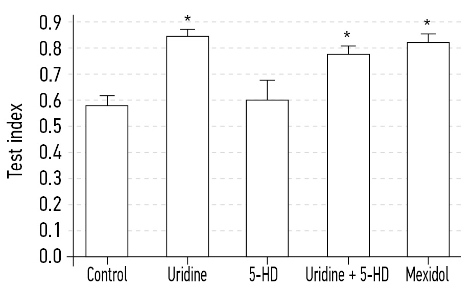 The results are presented in Fig. 3. In the CG, the TI was 0.57 ± 0.04. In the uridine-treated group, the recovery was more effective, as evidenced by a 1.5-fold increase in TI (0.85 ± 0.04; p < 0.001 vs. CG). The activity of uridine was comparable to that of mexidol, which increased TI by 1.5-fold (0.82 ± 0.05; p < 0.001 vs. CG). The use of uridine along with mitoKATP channel blockade did not significantly weakened its positive effect (0.78 ± 0.04; p > 0.05 vs. uridine), and 5-HD channel blockade did not affect the animals’ ability to recover (0.60 ± 0.07; p > 0.05 vs. CG).