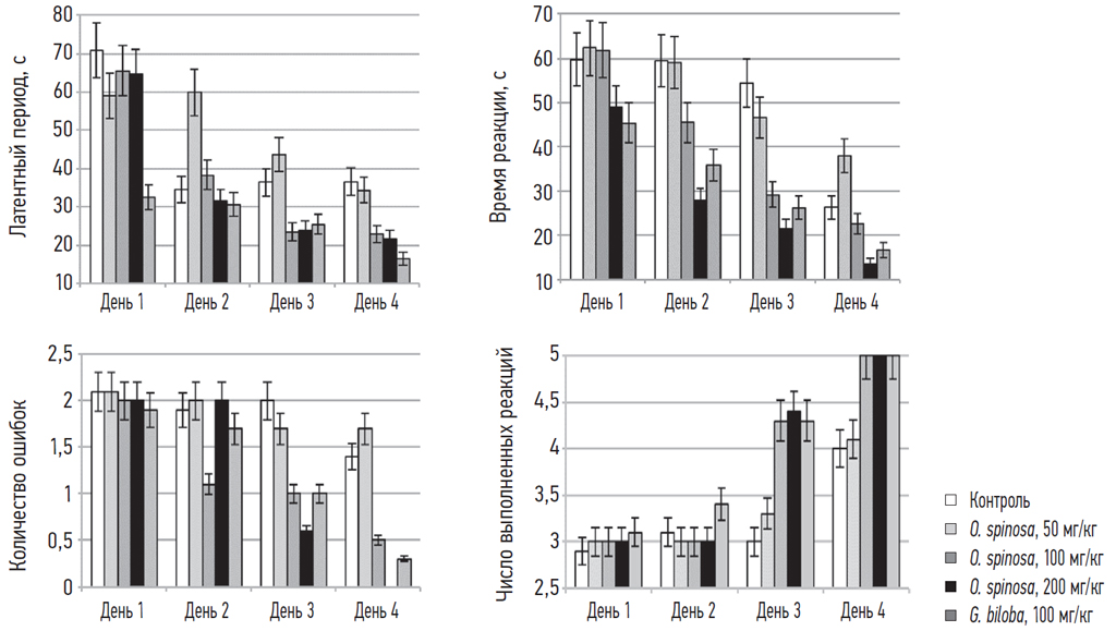 Во второй серии экспериментов исследовали влияние экстракта O. spinosa на выработку условного рефлекса с положительным подкреплением в Т-образном лабиринте. Положительным подкреплением служил корм животных, в связи с этим перед экспериментом животные также подвергались 48-часовой пищевой депривации. В течение 4 дней животных помещали в Т-образный лабиринт и ежедневно регистрировали следующие параметры: латентный период (время от момента посадки в стартовый рукав до выхода из него); время реакции (время между выходом из стартового рукава и взятием пищи); число выполненных реакций (число случаев, когда животное находило подкрепление в течение 180 с тестирования); число ошибок (число заходов в противоположный «подкрепляемому» отсек); число животных с выработанным рефлексом (критерием выработки рефлекса служили 5 безошибочных пробежек подряд).