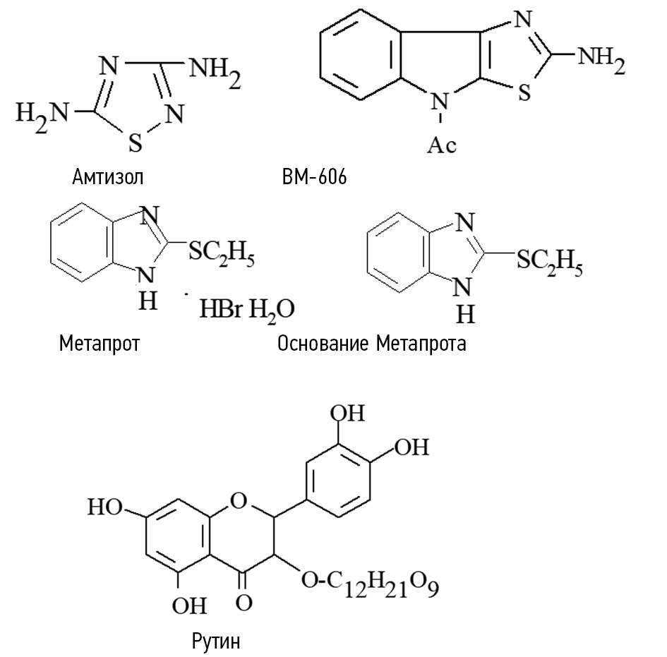 Для настоящей работы нами были отобраны несколько соединений, имеющих моно-, би- и трициклическое строение; их структурные формулы приведены на рис. 2. Все соединения, кроме рутина, синтезированы на кафедре фармакологии Военно-медицинской академии им. С.М. Кирова, содержат активные аминогруппы, а также атомы азота и серы в циклах: амтизол (3,5-диамино-1,2,4-тиадиазол), ВМ-606 (2-амино-4-ацетилтиазоло[5,4-b]индол), Метапрот (2-этилтиобензимидазол гидробромид гидрат) и основание Метапрота. Всем соединениям присуща антигипоксическая активность. Амтизол в 1990-е годы считался эталонным антигипоксантом [9], к сожалению, его внедрение в медицинскую практику застопорилось на уровне промышленного апробирования из-за экономических причин. ВМ-606 представляет собой оригинальное соединение, превосходящее амтизол по ряду антигипоксических активностей и обладающее также комплексом фармакологически полезных свойств [8]. Антигипоксические свойства Метапрота близки к таковым у амтизола, хотя несколько уступают ему.