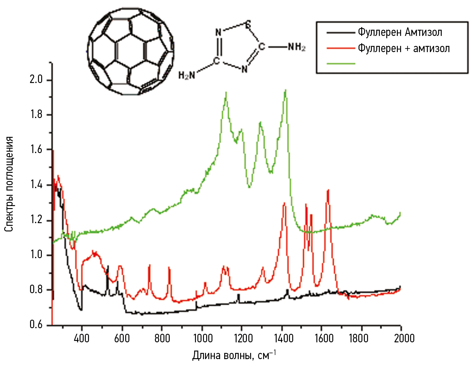 Как видно на рис. 3, ИК-спектры амтизола и фуллерена имеют значимые различия как по положению характеристических полос, так и по их относительной интенсивности. На результирующем спектре смеси 2 (фуллерена и амтизола) компонентов явно виден сдвиг полос в область более низких волновых чисел, а также их видоизменение.