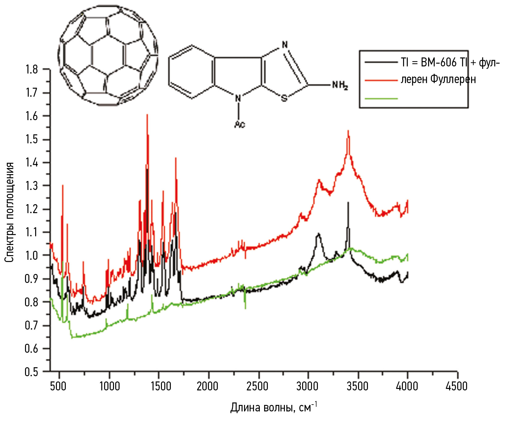 На рис. 4 приведен ИК-спектр препарата ВМ-606, комбинации ВМ-606 с фуллереном и фуллерена С60 в таблетках NaCl. В области «отпечатков пальцев» отсутствуют значимые различия между спектрами препарата и его смеси с фуллереном, однако на интервале волновых чисел 4000–3000 см–1 видны существенные изменения характеристических полос ВМ-606 в спектре его смеси с фуллереном. Наблюдается их заметное расширение, а также изменение относительной высоты. В данной области значений волновых чисел поглощают колебания конденсированных колец ВМ-606 (см. рис. 2). Все характеристические полосы от 4000 до 3000 см–1 отражают различные комбинации колебаний молекулы ВМ-606, которые затрагивают ароматические кольца.