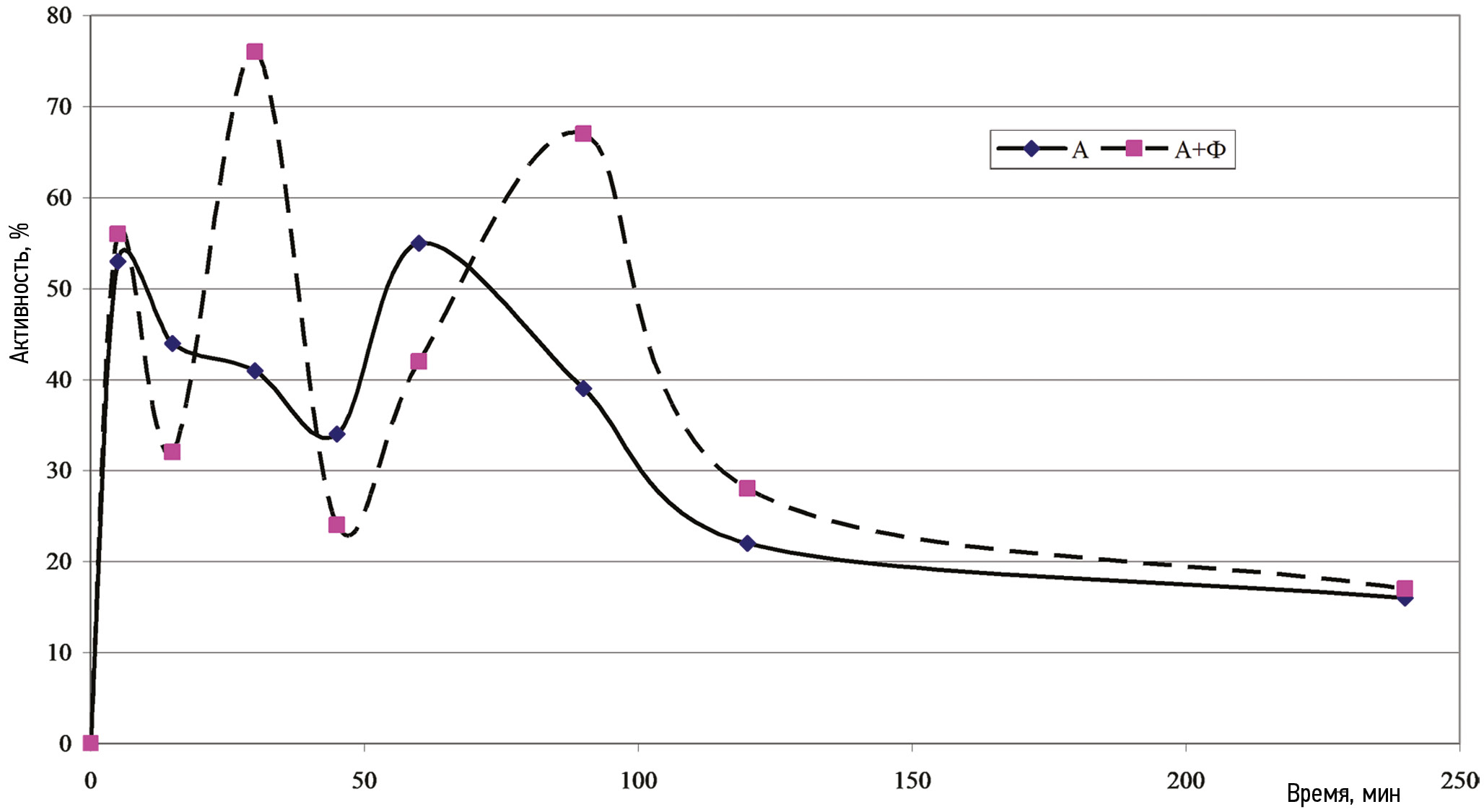 Рис. 5. Динамика активности антигипоксанта амтизола (А) и его эквимольной смеси с фуллереном (А + Ф) в течение 240 мин в модели гиперкапнической гипоксии на мышах относительно контроля