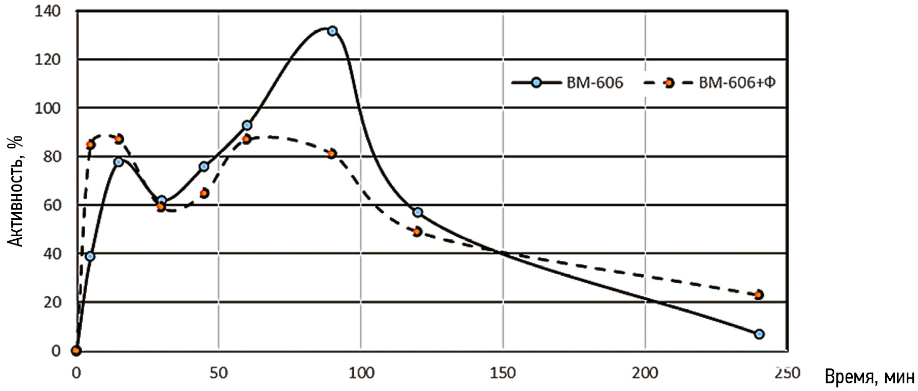 Рис. 6. Динамика активности препарата ВМ-606 и его эквимольной смеси с фуллереном (ВМ-606 + Ф) в течение 240 мин в модели гиперкапнической гипоксии на мышах относительно контроля
