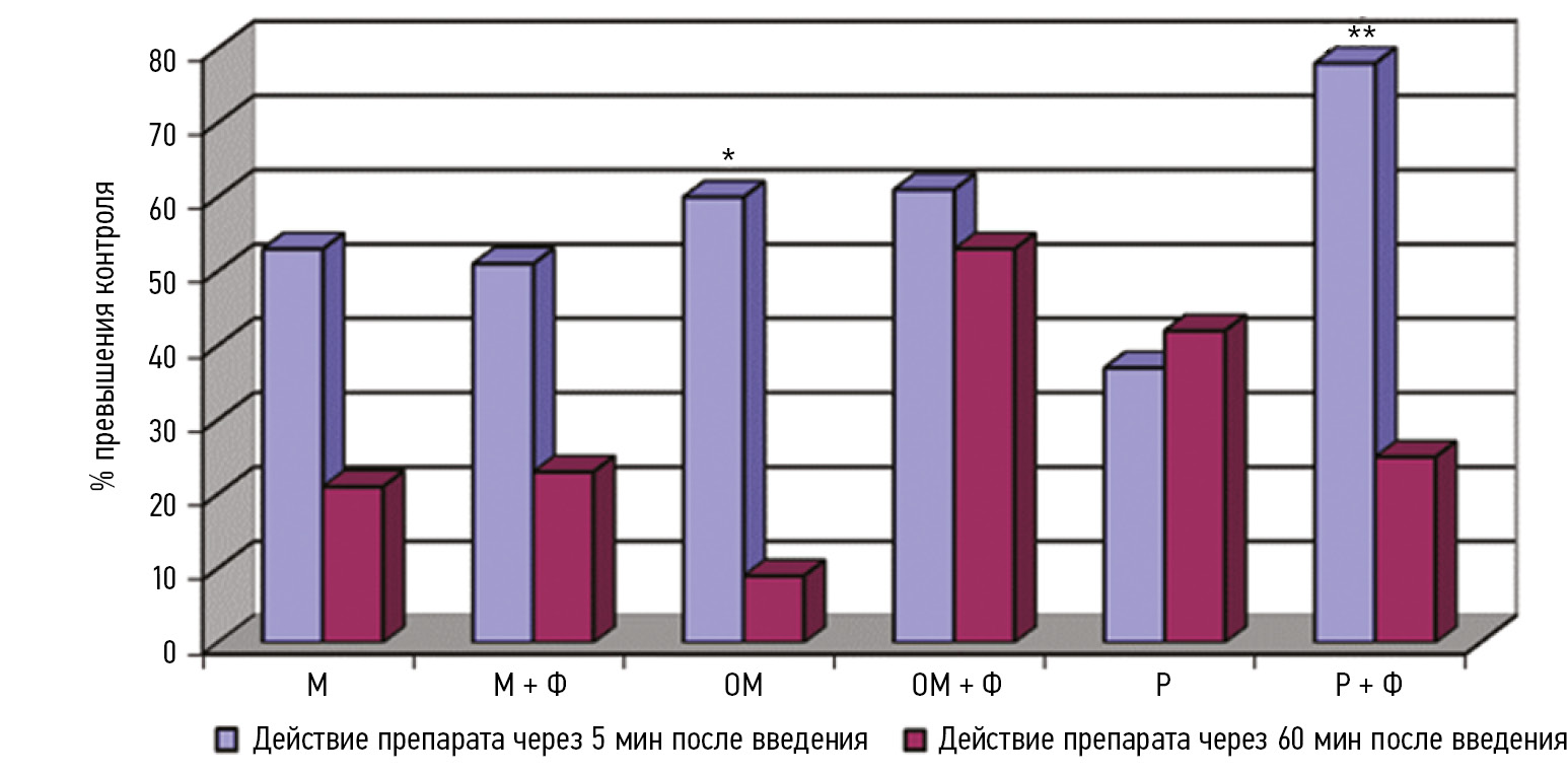 Рис. 7. Диаграмма антигипоксической активности Метапрота (М), основания Метапрота (ОМ), рутина (Р) и их комбинаций с фуллереном С60 (Ф) в модели гиперкапнической гипоксии через 5 и 60 мин после внутрибрюшинного введения