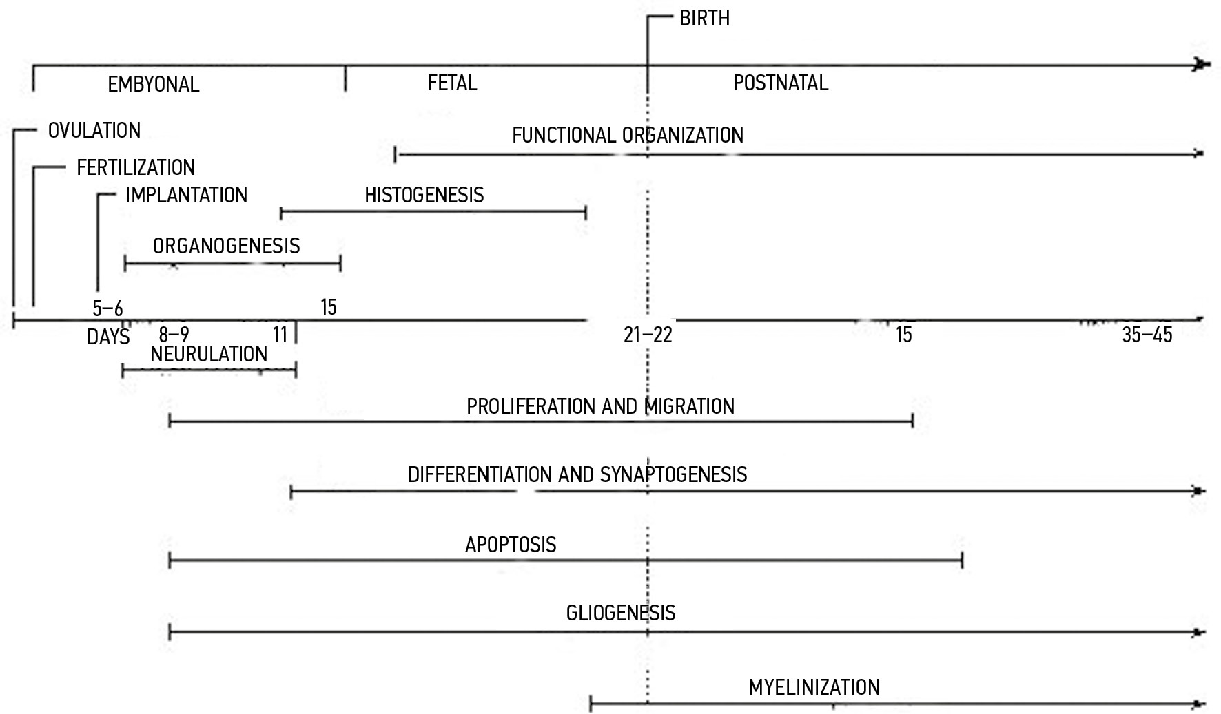 This study analyzed rats with a gestation period that lasts 21–22 days. However, a study showed [2] that neurotransmitter mechanisms in the brain are largely underdeveloped at birth and cannot provide an adequate behavioral response in newborn animals. Rats are born without fur and vision and only become fully developed and active by days 9–10. They are capable of self-sustaining behavior only by day 17 of postnatal development [3]. This finding was the basis for conducting experiments to identify critical periods of development in animal organisms. The experiments involved removing the animals from their mothers and growing them in single cages under complete intraspecific and partial sensory isolation. These and similar studies have demonstrated [4, 5] that in rats, the third trimester of pregnancy and early postnatal period (typically considered up to days 14–21 of life) are the most vulnerable to the effects of extreme environmental factors, such as hypoxia and neurotoxins. Data indicate that the prolonged maturation process of the brain’s biochemical systems affects both the prenatal and postnatal periods. Based on the established scheme of brain maturation [6], which relies primarily on neurohistological studies (Fig. 1), seven primary morphogenetic processes were identified: proliferation, migration, differentiation, synaptogenesis, apoptosis, gliogenesis, and myelination. These processes provide sufficient detail to characterize the maturation of the central nervous system structures.