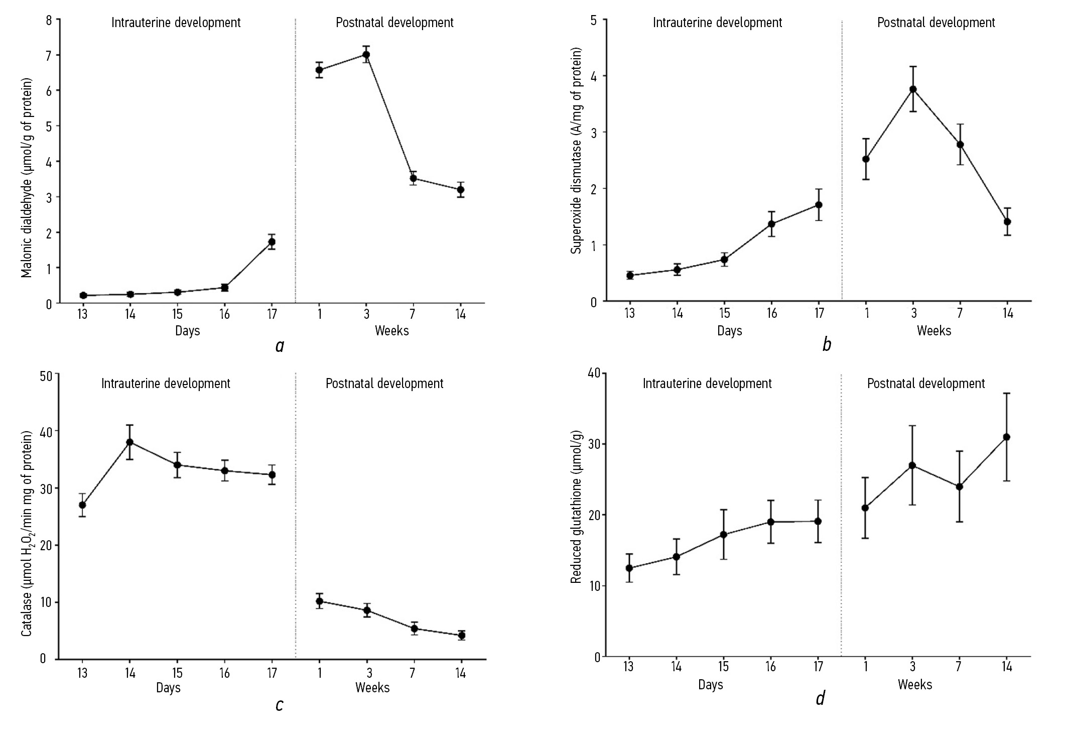 MATERIALS AND METHODS: Thirty-nine pregnant female Wistar rats weighing 220–250 g were selected, from which 176 embryos and rat pups of different sexes and age were obtained, including embryos in the third trimester of pregnancy (13–17 days of gestation) and rat pups aged 1–14 weeks. The concentration of malonic dialdehyde (indicator of lipid peroxidation) was determined in the brain tissue, and the activity of superoxide dismutase, catalase, and level of reduced glutathione was found as indicators of antioxidant defense systems.
