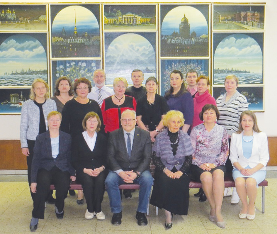 Fig. 3. Staff of the Department of Pharmacology in the foyer of the academy club (2017). From left to right standing: N. A. Kuritsina, N. D. Pyatibrat, I. V. Zarubina, V. V. Mikheev, G. G. Susla, E. R. Bychkov, L. I. Andreeva, S. A. Palchikova, N. V. Lavrov, A. A. Boykova, E. A. Lebedeva. Sitting: V. V. Marysheva, E. B. Katkova, P. D. Shabanov, R. P. Spivakova, M. V. Lukk, and T. E. Lebedeva