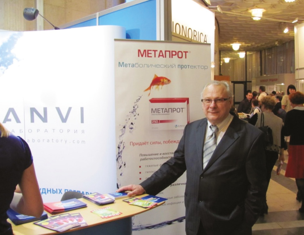 Fig. 6. At the V Congress of Therapists of Russia. Moscow (2010). P. D. Shabanov at the stand devoted to antihypoxant Metaprot (Bemitil)