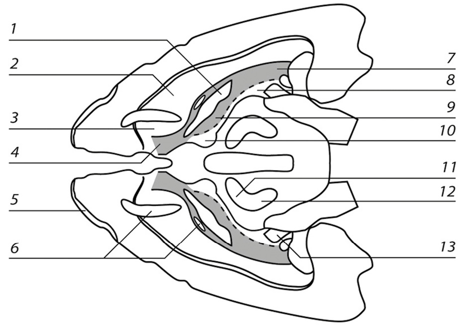 Fig. 2. Paraamygdalar complex structures (highlighted in dark) on a cross section of the rat brain: 1, dorso-ventral pallidum; 2, caudate nucleus-putamen; 3, nucleus accumbens (core); 4, nucleus accumbens (shell); 5, lateral olfactory tract; 6, anterior commissure; 7, central nucleus of the amygdala; 8, medial region of the amygdala; 9, lateral nucleus of the bed of the stria terminalis; 10, medial core of the bed of the stria terminalis; 11, paraverticular nucleus of the hypothalamus; 12, lateral hypothalamus; 13, optic tract [6]