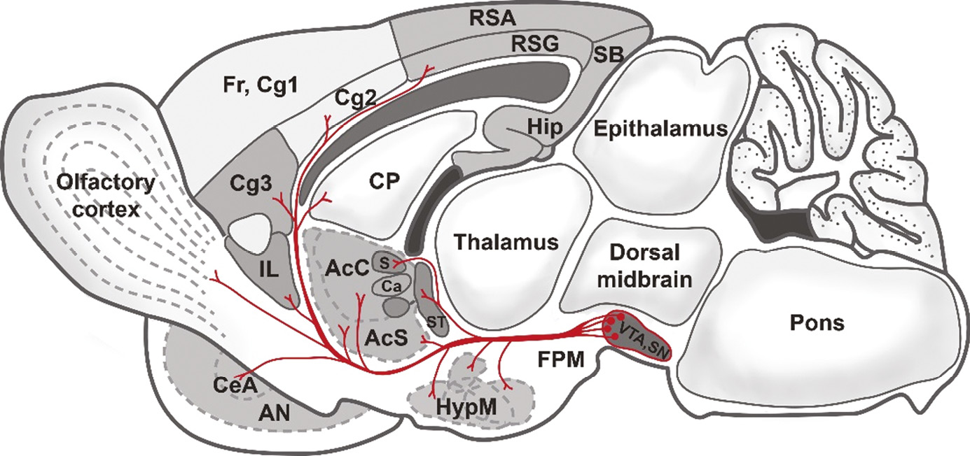 Fig. 3. Scheme of the main projection connections of the dopaminergic nuclei of the midbrain in rats [8]. VTA, SN, complex of ventral tegmental nuclei; VTA, ventral tegmental area; SN, substantia nigra of the midbrain; FPM, forebrain medial bundle; Pons, pons; Thalamus, thalamus; Dorsal midbrain, dorsal part of the midbrain; Epithalamus, epithalamus; HypM, hypothalamus medial; AcC, central part of the nucleus accumbens (core); AcS, nucleus accumbens cover (shell); S, septal nucleus; CeA, AN, complex of amygdala nuclei; IL, infralimbic field; ST, nucleus of the bed of stria terminalis; CP, globus pallidus; Olfactory cortex, visual cortex; Fr, Cg1, Cg2, and Cg3, anterior cingulate areas; RSA and RSG, retrosplenial cingulate areas; Hip, hippocampus