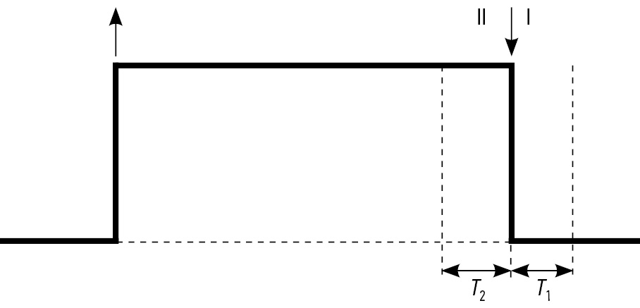 Fig. 5. Diagram illustrating the calculation of the “mismatch coefficient”. I and II are the moments of pedal depressing. Arrows indicate the beginning and end of stimulation