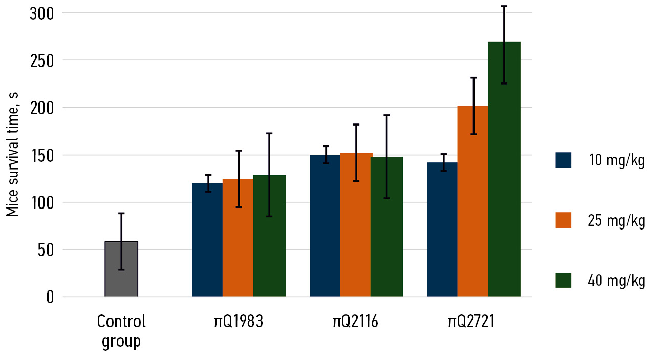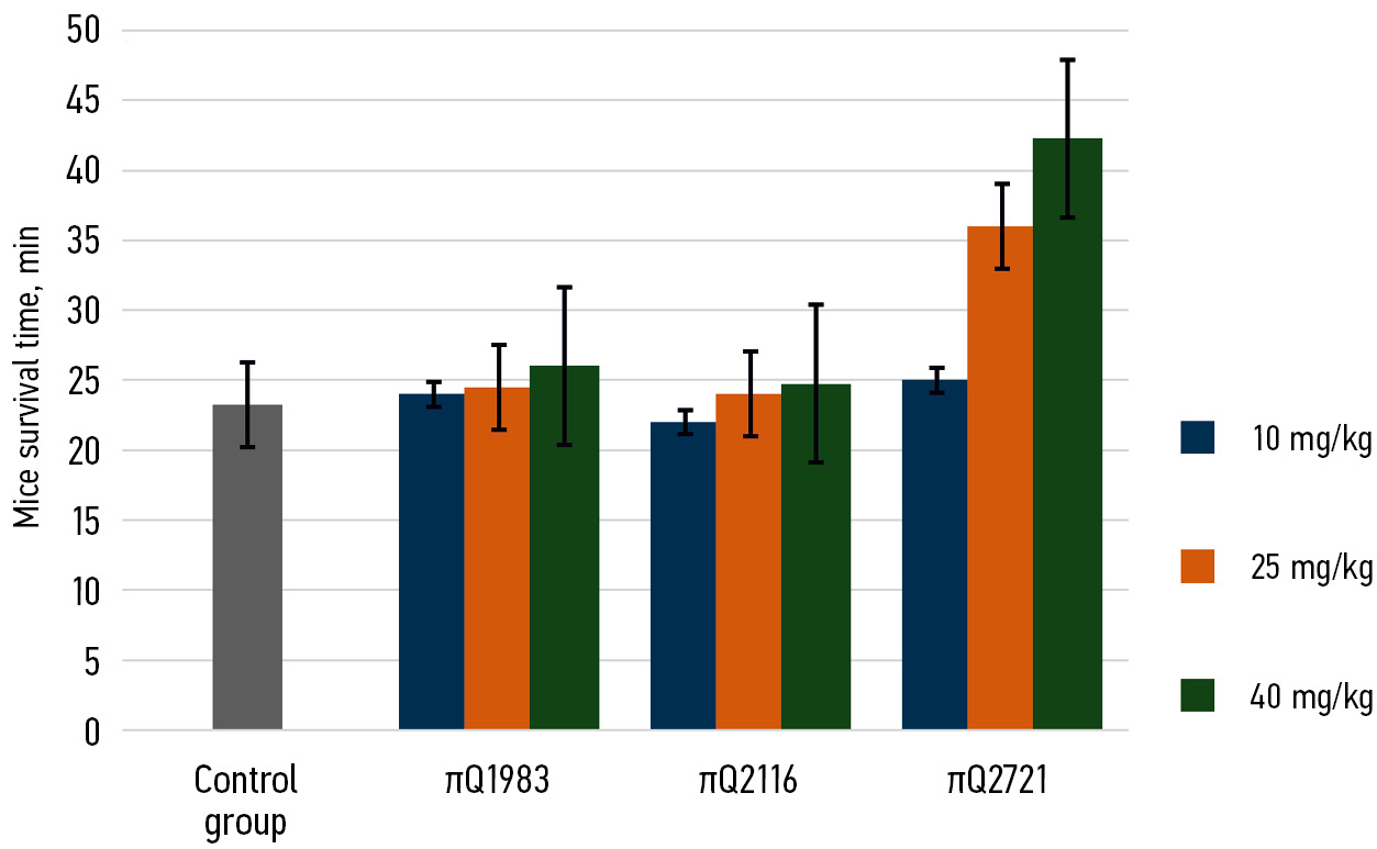 RESULTS: Of the 3 compounds examined, only πQ2721 showed the preconditioning effect in the acute hypoxia and hypercapnia model. After 7 days of administration at 25 and 40 mg/kg, animal life expectancy increased by 56.5 % and 82.6 %, respectively. Each compound demonstrated a beneficial effect on the mice’s tolerance to acute hypoxia in the acute hypobaric hypoxia model.