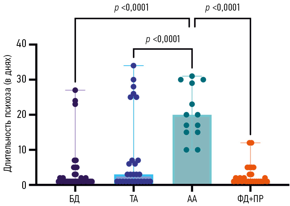 Fig. 1. Duration of psychosis across therapeutic strategies: БД, infusion therapy and benzodiazepines; TA, addition of typical antipsychotics to benzodiazepines; AA, addition of atypical antipsychotics to benzodiazepines; ФД+ПР, forced diuresis combined with propofol. P-values are presented according to one-way ANOVA with Tukey post hoc test.