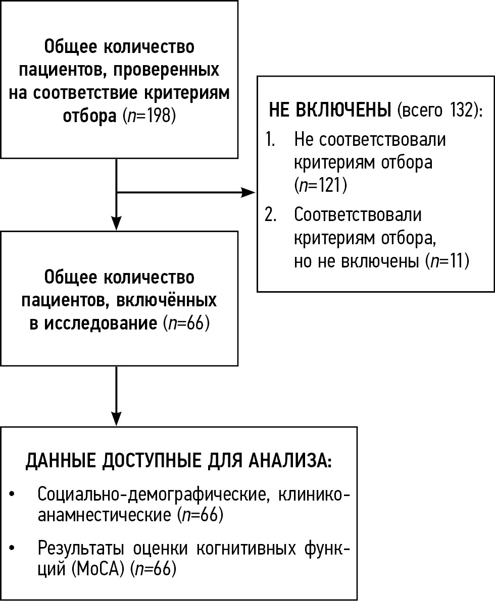 Рис. 1. Последовательность формирования исследовательской выборки: MoCA — Монреальская шкала оценки когнитивных функций. В исследование не включены 11 пациентов, которые одновременно соответствовали критериям отбора и критериям исключения (отказ от продолжения участия), либо критериям невключения по результатам скрининга.