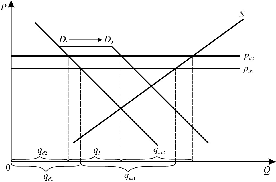 Примечание: D – спрос; S – предложение; pd – цена на внутреннем рынке; qd – потребление на внутреннем рынке; qex – объём экспорта; индексы «1» и «2» характеризуют состояние до и после начала закупочных интервенций соответственно.