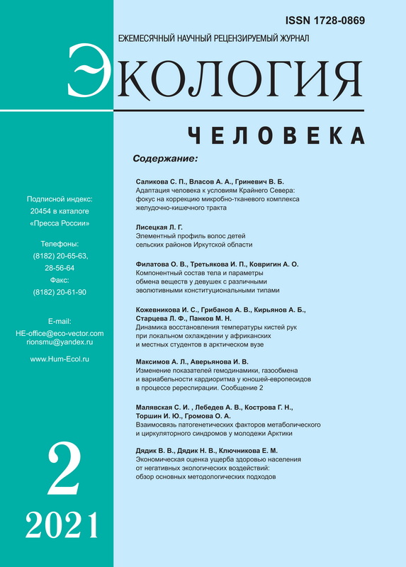 Введение. Под влиянием негативных факторов среды формируются дисэволютивный и патологический типы эволютивной конституции человека. Изучены адаптационные возможности, конституциональные особенности, физическая подготовленность у лиц с разными эволютивными типами конституции. Вместе с тем недостаточно изученным остается компонентный состав тела у представителей различных эволютивных типов конституции. Цель: изучение особенностей компонентного состава тела и параметров обмена веществ у девушек с различными эволютивными типами конституции. Методы. Проведено одномоментное поперечное исследование, в которое вошли 155 девушек-студенток в возрасте 17-20 лет, проживающих в г. Барнауле. Использован стандартный антропометрический инструментарий - ростомер. Для характеристики пропорций тела рассчитывался трохантерный индекс (ТИ), характеризующий тип возрастной эволюции человека (патологический, дисэволютивный, гипоэволютивный, нормоэволютивный, гиперэволютивный). Компонентный состав тела оценивался при помощи аппарата для биоимпедансометрии АВС-01 «Медасс». Для сравнения различий в количественных признаках между группами использовали непарный критерий Стьюдента и критерий Манна - Уитни в зависимости от распределения. Категориальные признаки анализировали с помощью критерия хи-квадрат Пирсона. Результаты. У представительниц нормоэволютивного типа наблюдается минимальная жировая масса тела (ЖМТ) в абсолютных (15,6 ± 4,38) кг и относительных (26,9 ± 6,73) % единицах. Выявлена группа девушек, склонных к повышенному жироотложению -это представительницы дисэволютивного типа со значениями ТИ 2,03 - 2,08 (количество ЖМТ составило (24,3 ± 12,40) кг и (34,5 ± 18,0) %). Нормированный основной обмен выше у девушек нормоэволютивного соматотипа (ТИ 1,95 - 2,0) - (34,0 ± 1,98) ккал/кг, р = 0,002, по сравнению с представительницами дисэволютивного типа (ТИ 1,86 - 1,91) - (33,3 ± 2,68) ккал/кг. Заключение. Выявленные в работе антропометрические и анатомические особенности у девушек, постоянно проживающих в г. Барнауле - на территории с высоким уровнем аэротехноген ного воздействия, могут быть результатом длительного действия поллютантов, обладающих эндокринразрушающим действием и загрязняющих окружающую среду города.