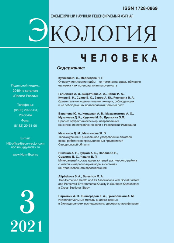 Introduction: Mineral content of tap water vary significantly between settings and may affect blood mineral composition in humans. The evidence from Arctic Russian settings is scarce. Aim: To assess blood mineral composition among residents of areas with low mineralization of water from underground sources distributed by centralized water supply systems in Arctic Russia. Methods: The study was performed in the town of Kirovsk, Murmansk region. Only permanent residents of the town aged 18-23 years participated. Concentrations of Ag, Al, As, B, Ba, Be, Ca, Cd, Co, Cr, Cu, Fe, K, Mg, Mn, Mo, Na, Ni, Pb, Sb, Se, Si, Sn, Sr, Ti, Tl, V, Zn, Y in tap water and whole blood were determined by atomic emission spectrometry. Results: Tap water in Kirovsk has an increased pH value, with a total mineralization of 65.0 mg/l with the legal limit of 1000 mg/l). Magnesium and calcium concentrations were 1 000-1 500 and 150-300 times below maximum permissible (MPC) concentrations, re spectively. The concentration of aluminum exceeded MPC by 30-50 % while concentrations of other elements were tens to hundreds times below MPC. In blood, calcium concentration was slightly below the average value for healthy individuals while and the magnesium content corresponded to normal values. An increased concentration of boron (2.45 ± 0.11 mg/l) was revealed. Conclusions: Contrary to expectations, residents of the area with low mineral content of tap water did not have a significant decrease in concentrations of calcium and magnesium in whole blood. No signs of increased concentration of heavy metals in blood of the residents were observed. Despite the high concentration of aluminum in water, its concentration in whole blood is within the physiological limits. At the same time, an increased blood concentration of boron was revealed warranting further research.