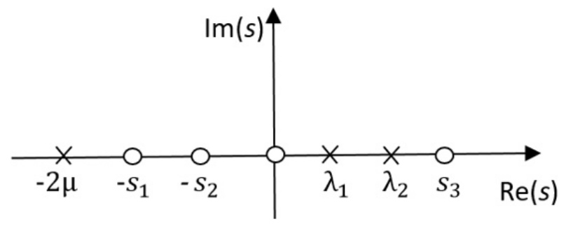 На рисунке отображены нули и полюса отношения на комплексной s – плоскости для исключения ошибок построения спектрального разложения. На рисунке полюсы отмечены крестиками, а нули – кружками.
