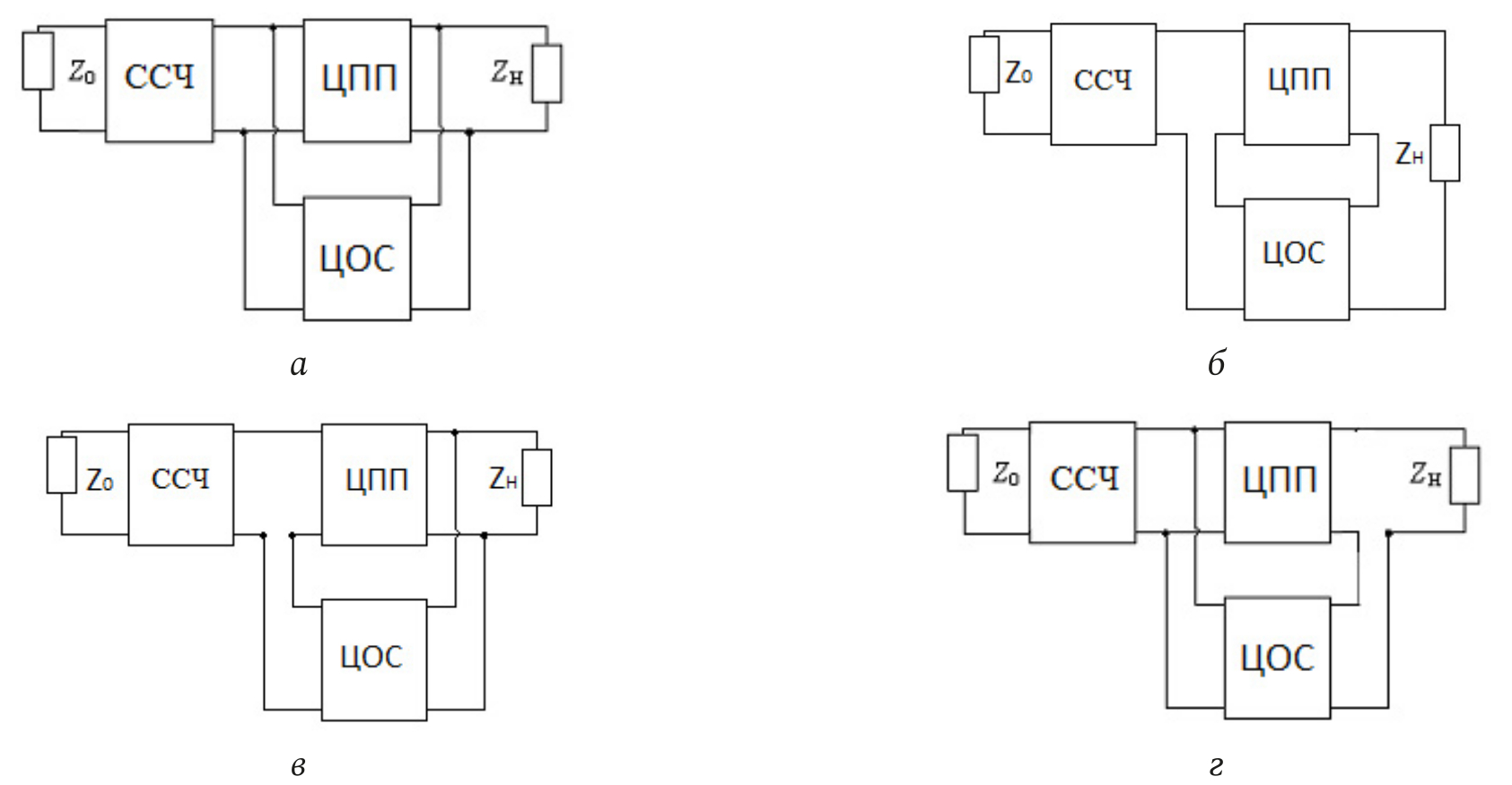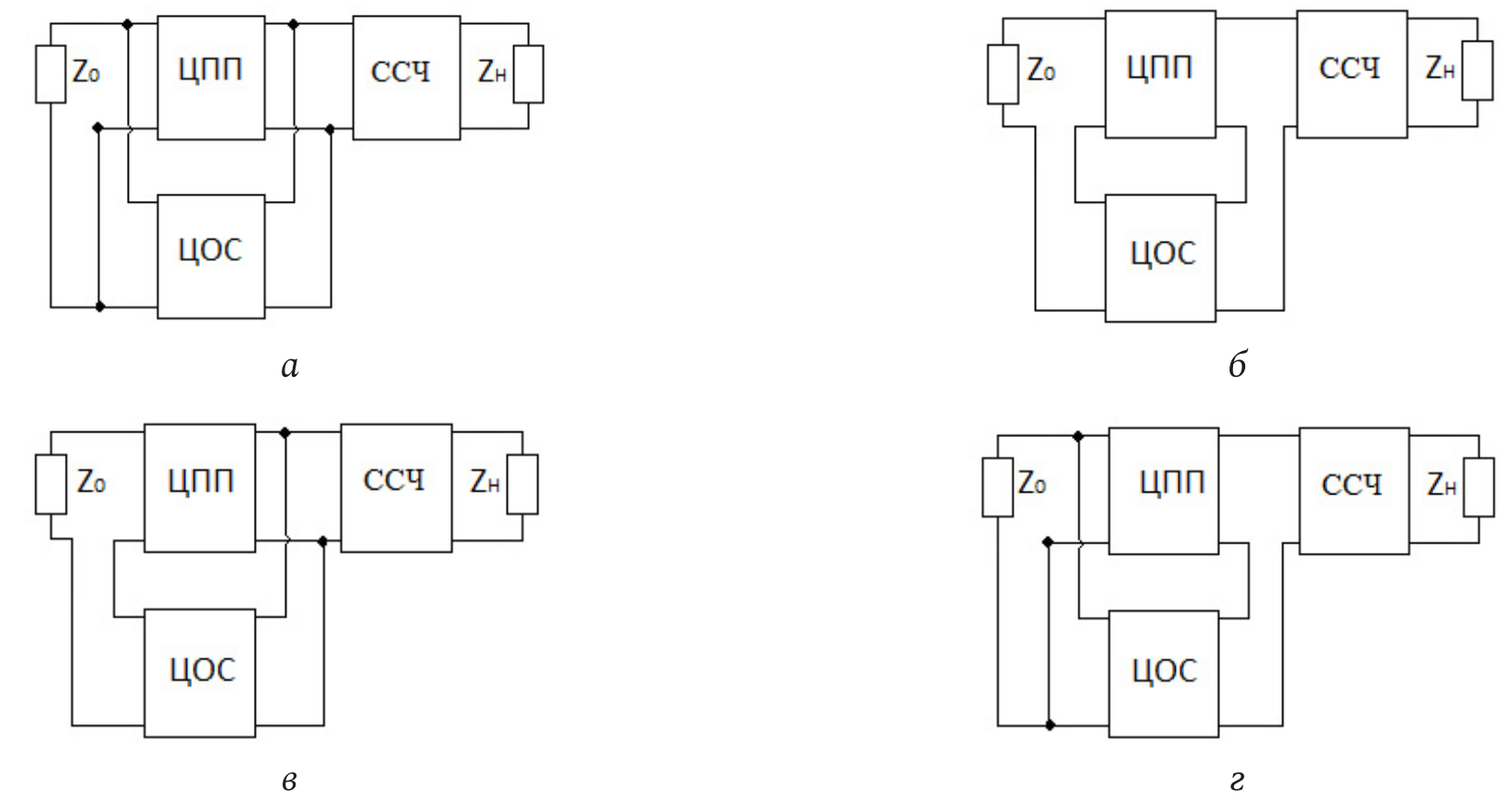 Рис. 1. Структурные схемы высокочастотных частей исследуемых автогенераторов с параллельной по напряжению (а), последовательной по току (б), последовательной по напряжению (в), параллельной по току (г) цепями обратной связи и цепью прямой передачи, включенными между ССЧ и нагрузкой