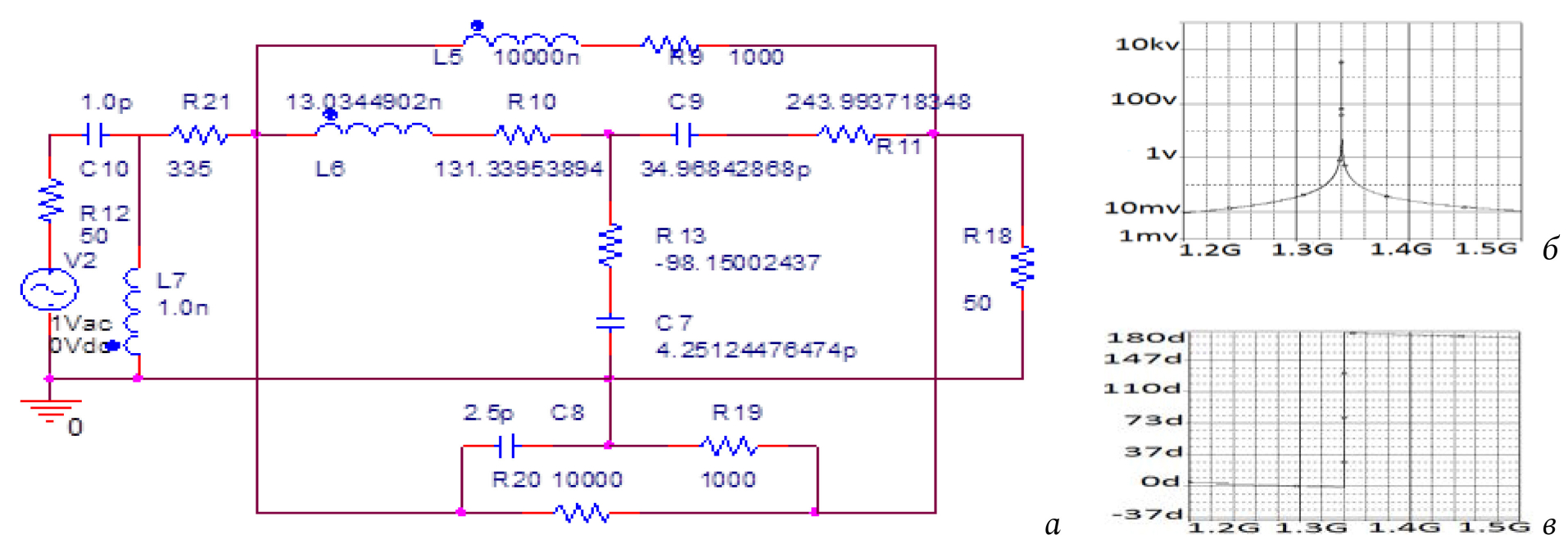 Рис. 4. Эквивалентная схема (а) автогенератора (рис. 6, а) и ее АЧХ (б) и ФЧХ (в), полученные путем схемотехнического моделирования в системе «OrCad»