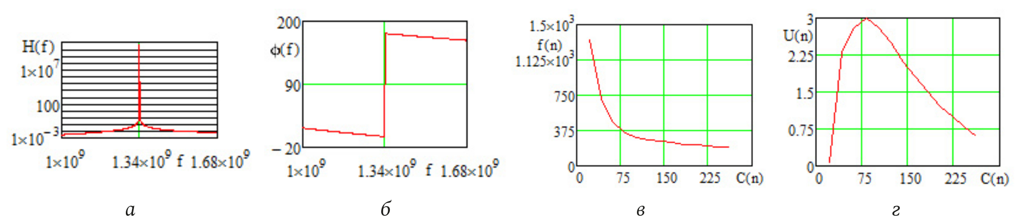 Рис. 5. АЧХ (а) и ФЧХ (б) эквивалентной схемы (рис. 4, а) автогенератора (рис. 6, а), полученные расчетным путем в системе «Mathcad», зависимости частоты (МГц) (в) и амплитуды (В) (г) генерируемых колебаний от емкости (пф), полученные в системе «Microcap»