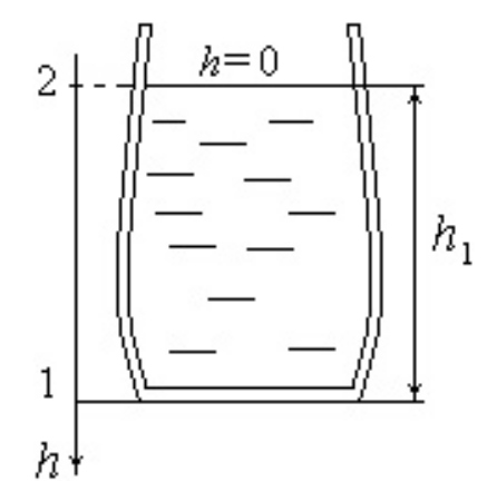 Пусть в сечении 1, у дна резервуара координата а гидростатическое давление На поверхности жидкости в сечении 2 находится начало координат где давление Используем давление, избыточное над атмосферным. Так как жидкость находится в состоянии покоя, то ее вязкость роли не играет.