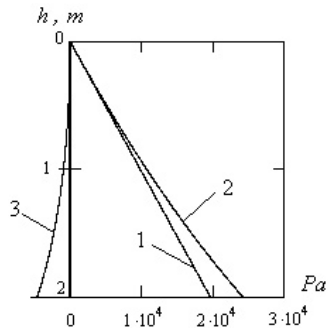Рис. 3. Распределение давлений по высоте вертикального резервуара с упругими стенками: прямая 1 – гидростатическое давление 2 – давление 3 – объемная плотность энергии растянутой упругой стенки резервуара –
