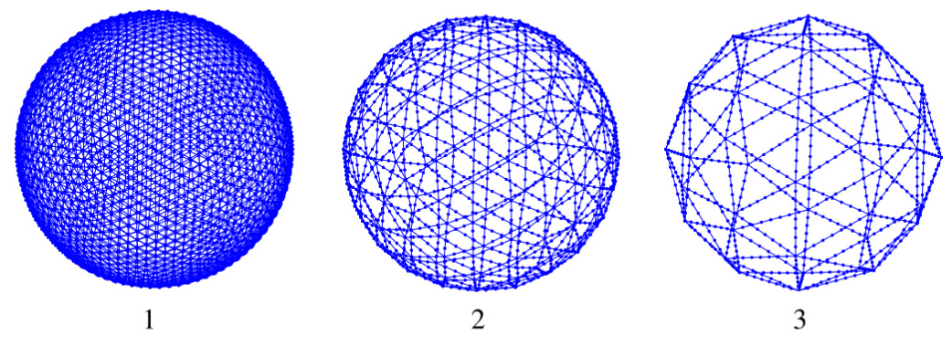 We consider three spherical objects (Fig. 2) centered at the origin O of the Cartesian coordinate system as test structures. These objects are formed by thin metal conductors Lj of radius . The radius of the sphere described around the objects under consideration is denoted as r. The structures will be excited by a plane electromagnetic wave (PEW) propagating along the Ox axis and polarized toward the Oz axis, having unit amplitude and zero initial phase. The set of conductors Lj forms a grid surface with triangular cells that slightly differ from an equilateral triangle, the length of which is denoted as d. It is assumed that each conductor can be represented as D segments s of equal length , and the distribution of the total current on each of them can be considered uniform ( where l is the longitudinal coordinate on s). Thus, from the set of conductors, we proceed to a set of segments in which an EMF is described by Eq. (9), and the solution to the interior problem is described by Eq. (11).