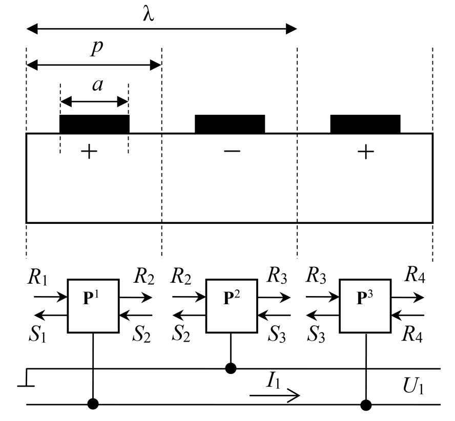 Следуя идеологии метода Р-матрицы, топологию фильтра можно представить в виде, показанном на рис. 2, в. Один из ВШП является входным преобразователем и подключен к входному порту. Электрические порты по выходным ВШП соединены параллельно. Акустические порты блоков соединены последовательно друг с другом в соответствии с топологическим описанием. Акустическая связь между преобразователями, а также отражательными структурами определяется распределением поля акустических волн в направлении соответствующих структур. К входному порту приложен потенциал U1, к выходному – U2, через них текут токи I1 и I2 соответственно.