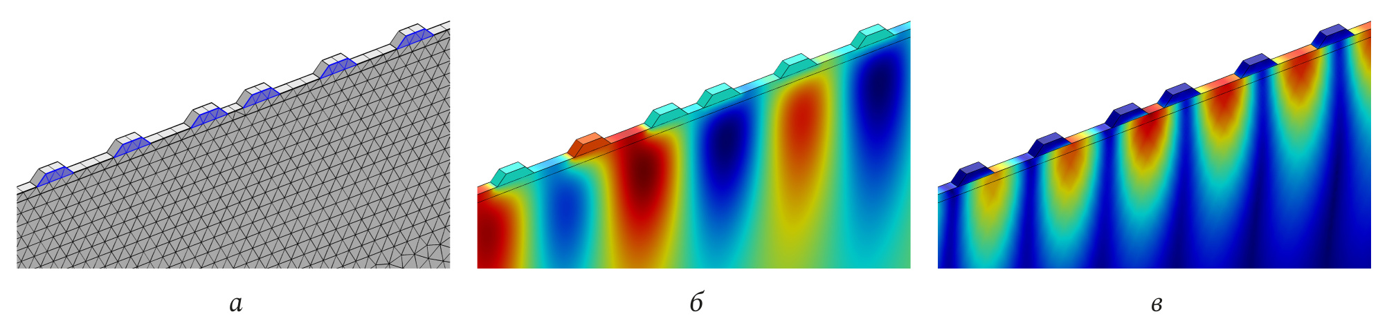 Рис. 6. Пример отображения для участка геометрии фильтра DMS: а – построенной сетки; б – распределения потенциала; в – распределения механического смещения