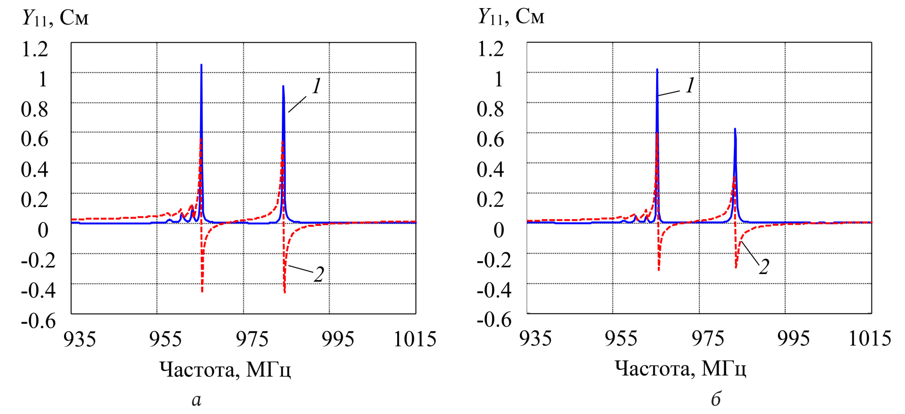 Рис. 7. Входная проводимость Y11 одного звена фильтра DMS, рассчитанная с помощью МCМ (а) и МКЭ (б): 1 – Re(Y11), 2 – Im(Y11)