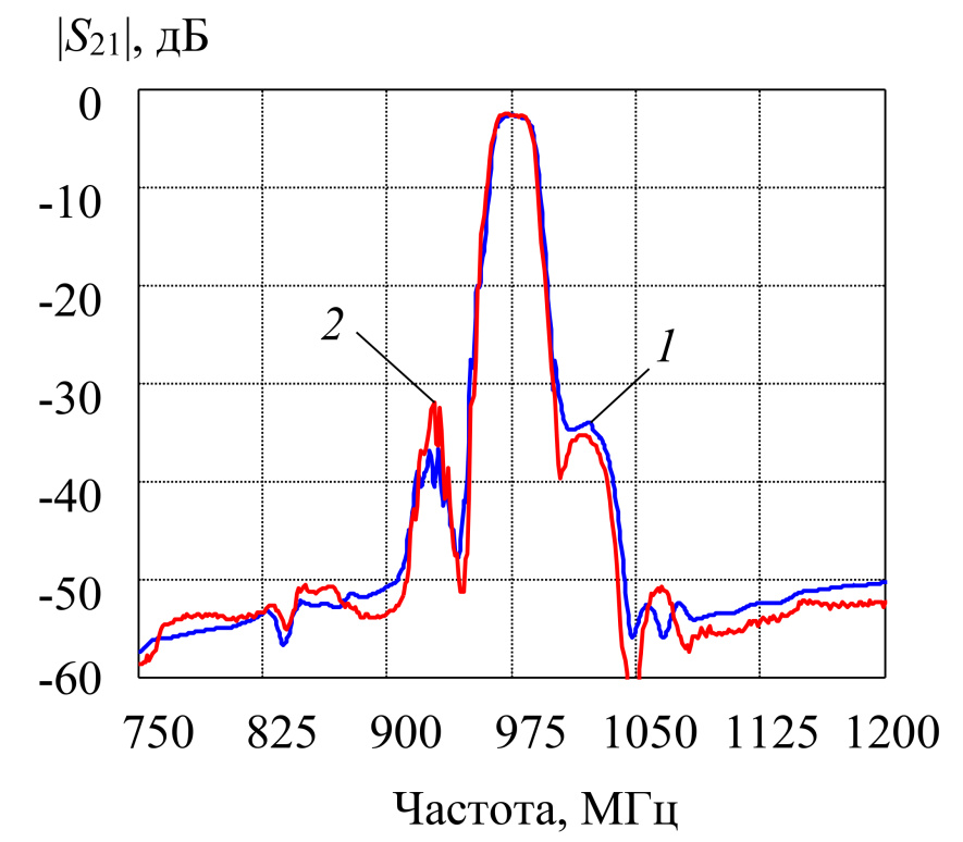 Рис. 9. АЧХ 2-каскадного фильтра DMS: 1 – расчет МСМ, 2 – эксперимент