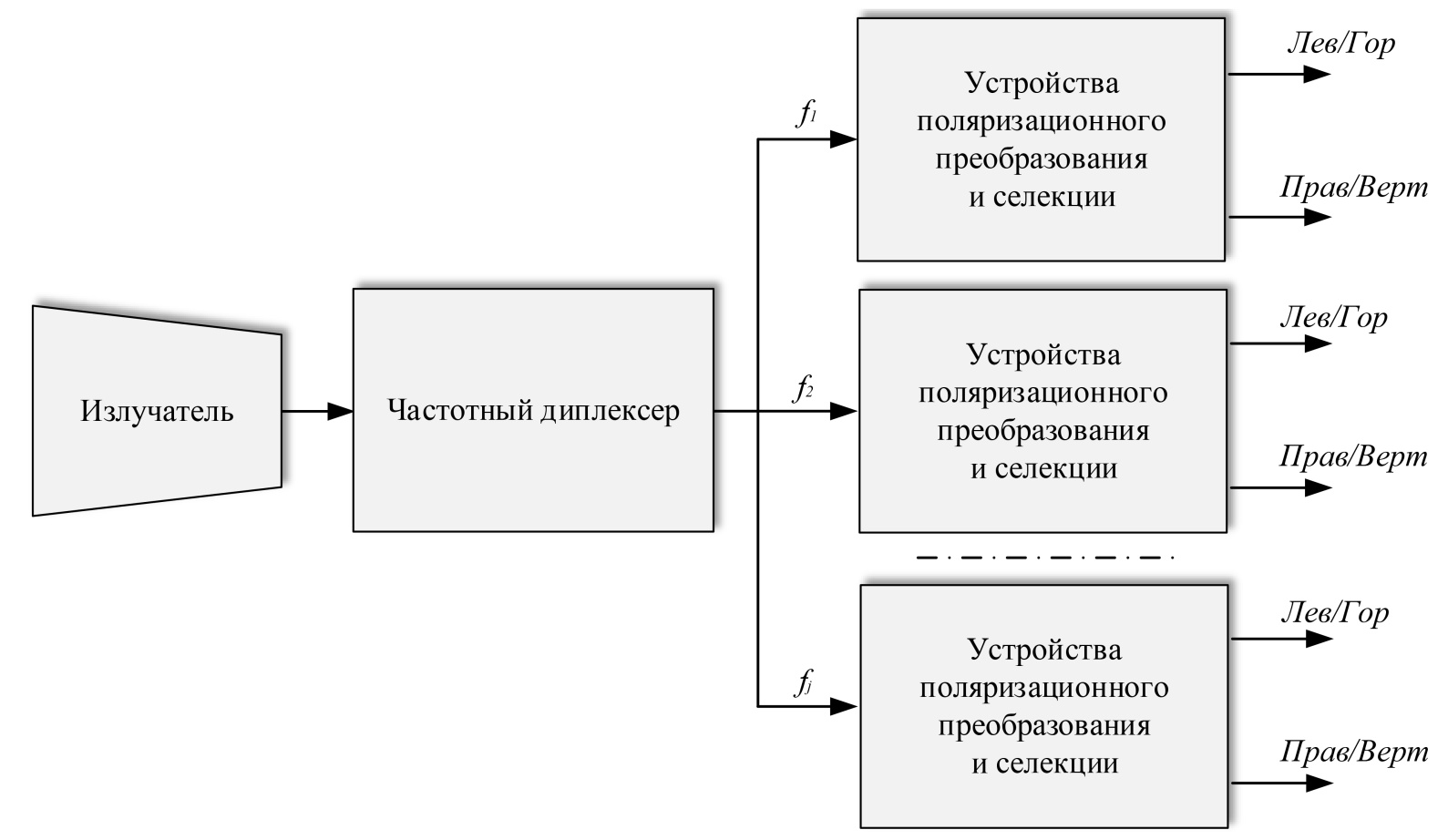 Использование таких антенн приводит к необходимости решения вопросов построения антенно-волноводных трактов (АВТ), обеспечивающих эффективное разделение принимаемых сигналов по частоте и поляризации. При этом под эффективностью разделения сигналов следует понимать отношение сигнал/(помеха + шум) на выходе соответствующего частотно-поляризационного канала МЗА при заданном распределении мощностей принимаемых сигналов и шумов по частотным диапазонам и поляризациям. Помехой в этом случае являются сигналы того же или близких диапазонов частот других поляризаций.
