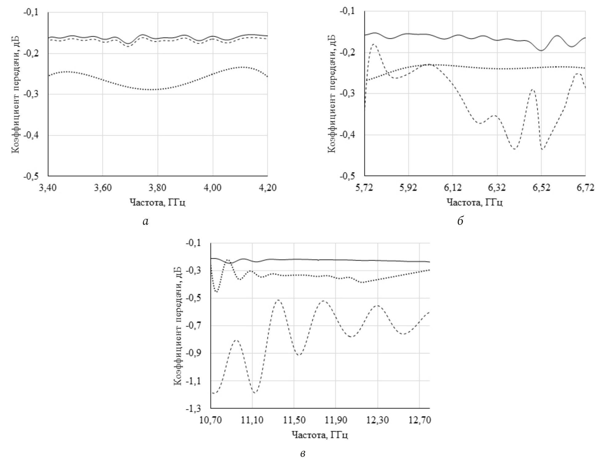 Рис. 2. Частотные зависимости обобщенного коэффициента передачи: а – в диапазоне частот 3,4–4,2 ГГц; б – в диапазоне частот 5,8–6,6 ГГц; в – в диапазоне частот 10,7–12,7 ГГц