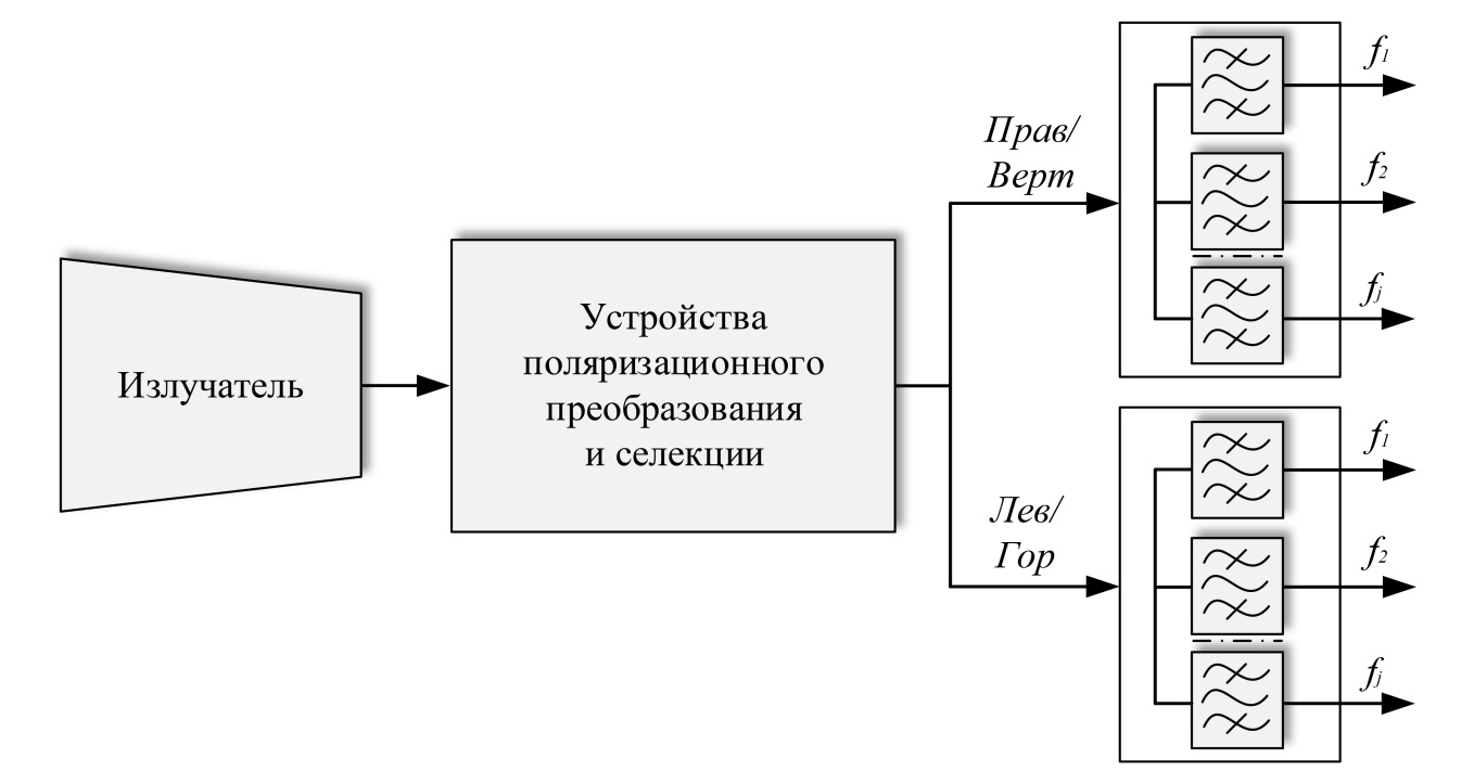 Антенно-волноводный тракт в МЗА ССС представляет собой устройство с одним входом и выходами, в каждом из которых формируется сигнал одного диапазона частот и одной поляризации …, – выделенный на выходе АВТ сигнал l-го частотного диапазона одной из четырех возможных видов поляризаций). Каждый из сигналов на выходе АВТ соответствует приему сигнала с k-м набором частотно-поляризационных характеристик и может быть представлен с использованием следующего выражения