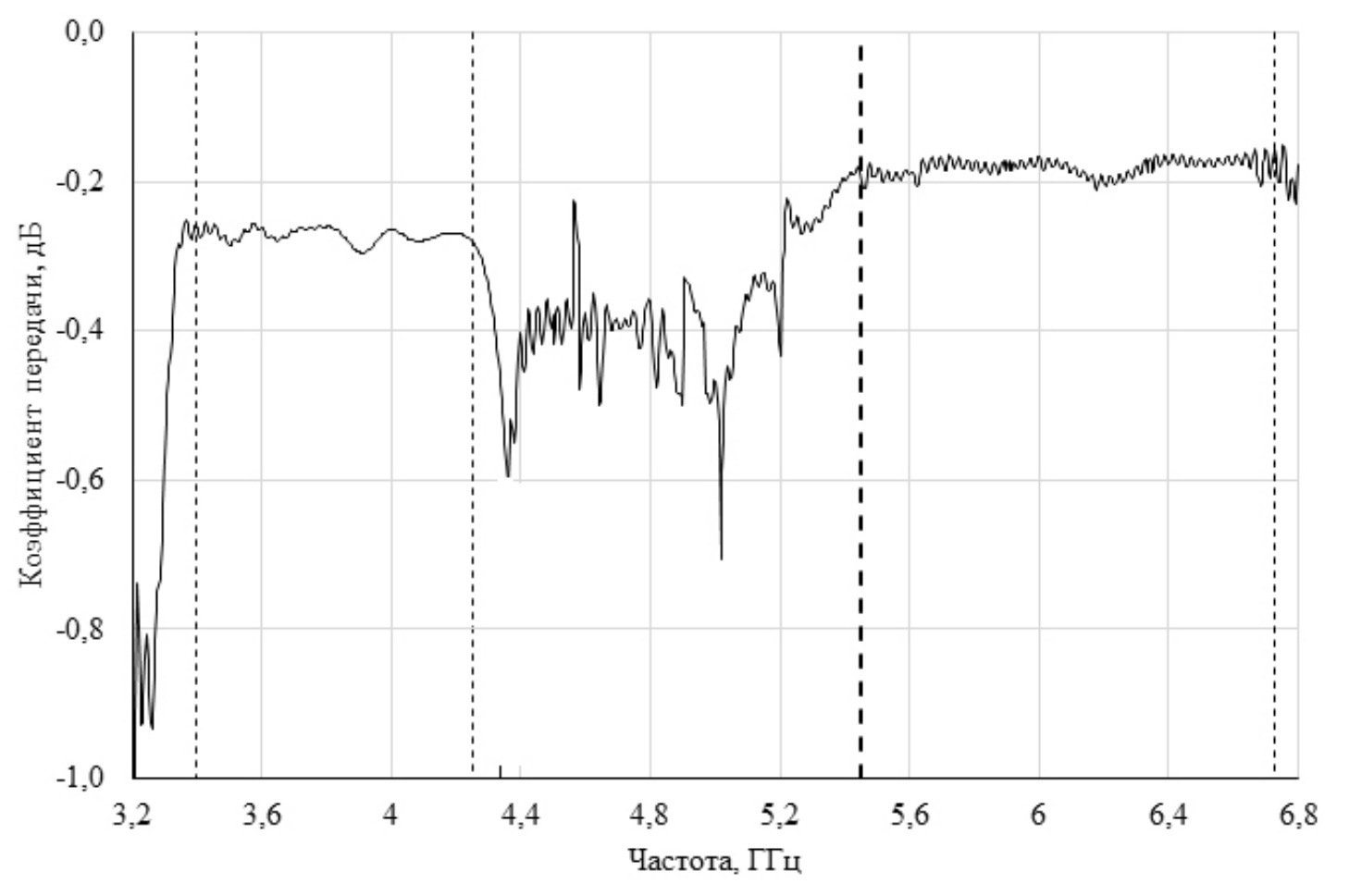 На рис. 4 для устройства поляризационного преобразования и селекции приведены результаты измерений частотной зависимости обобщенного коэффициента передачи в полосе частот 3,4–6,8 ГГц. В полосе частот 4,3–5,45 ГГц наблюдается ярко выраженная резонансная зависимость коэффициента передачи, вследствие чего возможно совмещение только двух диапазонов с центральными частотами 3,85 и 6,1 ГГц и полосами частот 0,9 ГГц и 1,4 ГГц соответственно.