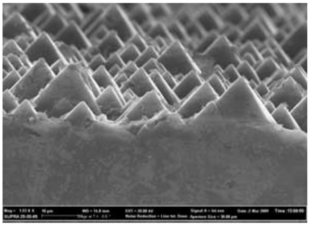 Покрытие фторида диспрозия было нанесено равномерно по всей поверхности пирамиды. Однако очень тонкие пленки могут обладать дефектами и «рваться» о вершины пирамид, нарушая равномерность и влияя на свойства полученных структур.