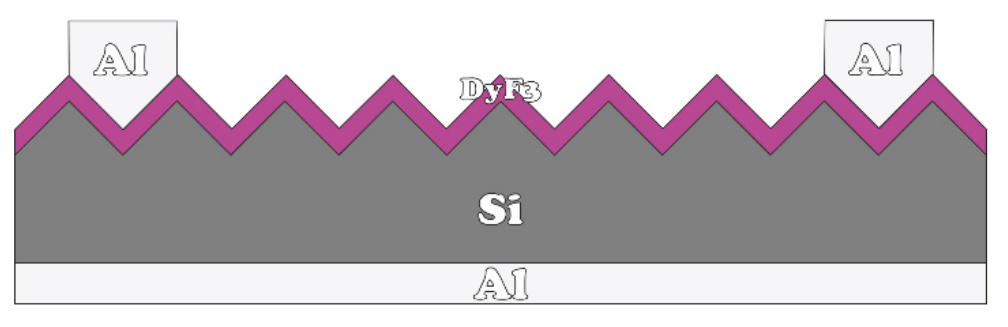 Алюминиевые контакты были нанесены методом термического испарения в вакууме с двух сторон: на p-сторону был нанесен сплошной контакт, на n-сторону – контакт в виде гребенки. Покрытие также наносилось методом термического испарения порошкоообразного фторида диспрозия.
